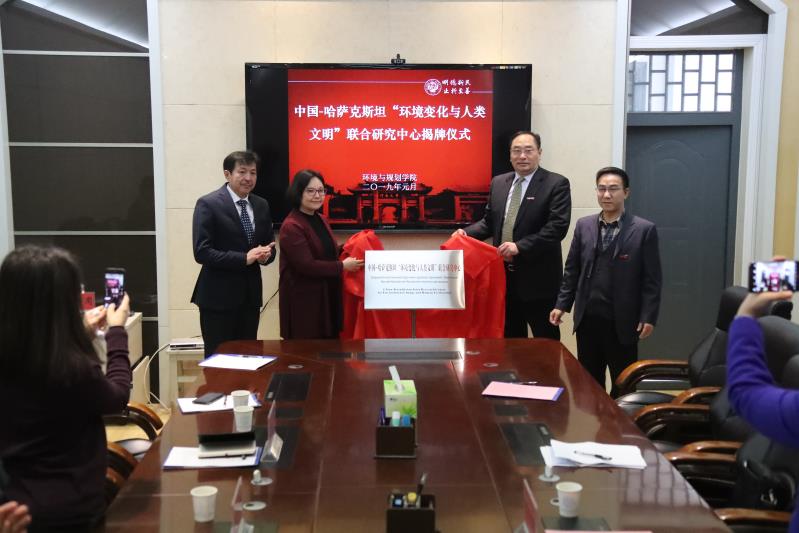 哈萨克斯坦国立大学三位代表Aizhan Skakova博士(生态研究所所长)、Almagul Baubekova 博士(生命科学学院副院长)、Gani Omarov 博士(考古系主任)和我校外事处毛立群处长、我校环境与规划学院傅声雷院长和翟秋敏副院长等一起参加了揭牌仪式。揭牌仪式结束后,联合中心举办了第一次学术研讨会,有八位学者做了学术报告。报告主要涉及哈萨克斯坦和我国新疆地区的气候变化、考古发现、生态环境问题等。元月9日,考古学家Gani Omarov 博士参观了我校考古系的实验室,并与考古系的同事进行了深入的交流;微生物学家Almagul Baubekova 博士参观了生态地理实验室,并与傅声雷教授团队的成员进行了深入交流;气候学家Aizhan Skakova博士也参观了生态地理实验室,并与秦明周教授和他的团队成员进行了深入交流。